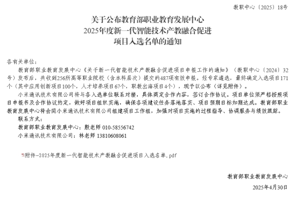 新一代智能技术产教融合促进项目由教育部职业教育发展中心联合小米通讯技术有限公司共同实施申报,主要聚焦人工智能、智能物联(AIoT)、智能制造、智能网联、新能源汽车、智能产品等新一代智能技术领域,在教师能力提升、人才培养创新、国际合作等维度,探索校企协同育人的新模式和新范式。在人才培养项目中,小米公司将与学校在专业建设、课程开发、实训基地建设等方面深入合作,共同推进人才培养。