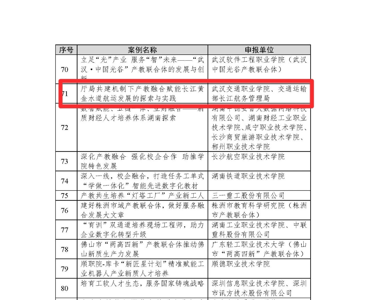 新闻网讯(通讯员 吴雨佳)近日,教育部职业教育与成人教育司公布了2024年产教融合、校企合作典型案例遴选结果,在全国高校中共遴选出133个产教融合、校企合作典型案例。由武汉交通职业学院、交通运输部长江航务管理局共同申报的《厅局共建机制下产教融合赋能长江黄金水道航运发展的探索与实践》名列其中。